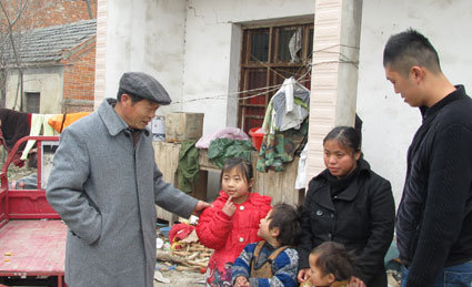 图为高俊平(左一)、甄岩岩(右一)在看望被救起的岳爱敏和她的3个孩子。