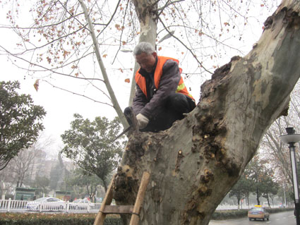 2月28日下午3点,园林工人罗师傅正在对洞山中路上的一株法桐进行修剪工作(如图)。几个园林工人把掉在地上的枝条捆在一起运走,保持城市清洁。当天下午,随着最后20多株法桐的修剪完毕,整个洞山中路的法桐修剪工作也全部完成。
