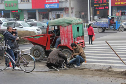 图:施工人员正在给堵住斑马线的绿化带铺设人行道砖