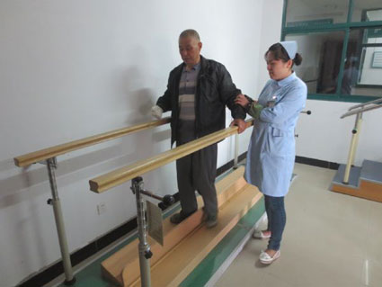图:姚师傅在医护人员的搀扶指导下,在平衡杠上做康复训练。