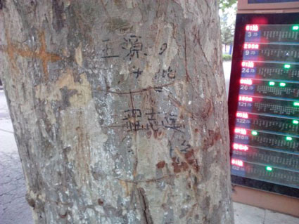 行道树是一种公共资源,它们被用来装扮市容、美化城市,点缀着一座城市的美景。而在树身上刻划,会给树木生长带来严重的危害。树木被刻划之初一般会有组织液流出,造成树木的营养流失,或者吸引病虫从而造成虫害。之后被刻划轻微的树木伤处会自动愈合,严重者则会使局部干枯、腐烂,甚至造成树木死亡。