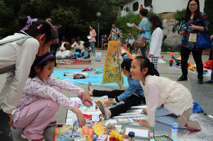 图:小朋友们正在二手闲置物品交易活动现场交易