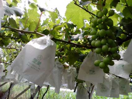 下车走向葡萄园,浓烈的阳光炙烤着大地,而葡萄园里却是一片清凉。这里的葡萄生长很好,每株都结上了四五串果实,成串青绿饱满的葡萄透出诱人的香甜气息,而更多的葡萄则包裹在防水、透气的白色专用套袋里。
