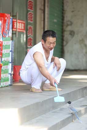 淮南市人民路上,一个小超市门口,常常有一只灰喜鹊飞来飞去,只见它一会儿停在路边的电瓶车上,一会又飞到超市的柜台前,或者蹦蹦跳跳地在门口散步,来往的路人伸出手摸摸它,它也丝毫不畏惧,在你身边卖个萌,非常有趣。据这只鸟的主人罗先生介绍,这只鸟的名字叫“莎莎”,一直是散养在店里的,说起来还有段有趣的经历。罗先生说,刚养这只鸟的时候,城管文明督导员告诉罗先生店门口的大树上不允许挂鸟笼,于是罗先生就把鸟放了出来,城管文明督导员赶紧阻止罗先生说,别让它飞跑了啊!后来才发现虚惊一场,“莎莎”不但不飞跑,还悠闲地在店门口散起了步。从此以后,罗先生再也没有给“莎莎”用过鸟笼,莎莎和附近的邻居成了好朋友,陪罗先生一起看店,一起去公园。7月21日下午,记者看到它的时候,它正陪着罗先生打苍蝇,主人打下一只苍蝇,“莎莎”就跑去把苍蝇吃掉。