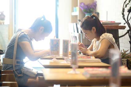 图为炎炎夏日,商贸文化广场里,某甜品店,两位正在使用WiFi的女生。