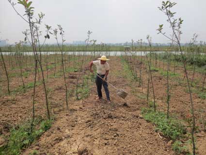 图:曹咀生态园里,工人正在平整土地培育苗木。