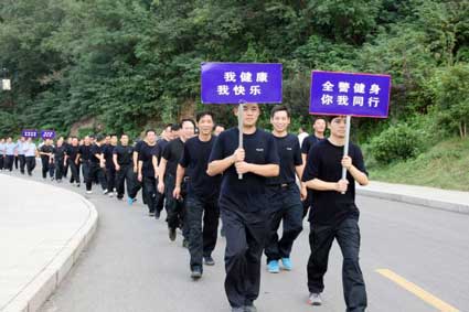 9月5日下午4时30分左右,在八公山公安分局大院里,民警们穿着统一警用T恤和长裤,警容严整、精神抖擞地齐聚在这里。不一会儿,随着一声令下,民警们从大院出发,沿着八公山风景区的山路行进。