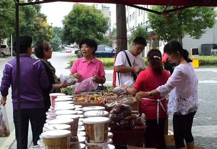 9月15日10时左右,在淮南舜耕旅游购物街上,一个淮南地方特色产品展销会吸引了过往路人的目光,出于对豆制品等淮南地方特色食品的热爱,不少市民前来品尝购买(如图)。