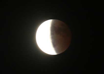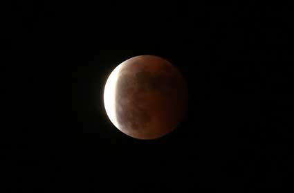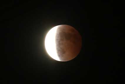 备受关注的月全食昨晚精彩上演,北京时间10月8日下午5时14.4分,月亮进入初亏(月球刚进地球影子);晚上6时24.6分为食既(月球刚刚全部进影子);晚上6时54.6分为食甚(月球进影子深处);晚上7时24.5分是生光(月球刚出地球影子);晚上8时34.7分是复原(月球刚刚全部出地球影子)。我市肉眼可观察月亮时间大约在下午6点(如图),直至晚上8时30分左右全部结束。