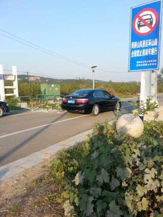 记者在现场看到,入口处设有活动闸口,闸口北侧部分是可以活动的铁栏杆,已被锁链锁上,而南侧部分却有两米多宽,没有设置障碍,车辆可以自由出入。在此入口处,记者看到,一辆黑色轿车停在入口处铁栏旁,而一旁的路口完全敞开,不时有车辆从此经过。记者观察了10多分钟,有5辆机动车经过。在入口处设置了一个十分明显的禁止机动车通行的标牌,且牌子上明确写着“舜耕山风景区环山路全段禁止机动车通行”的字样,然而一些驾驶员却视而不见。