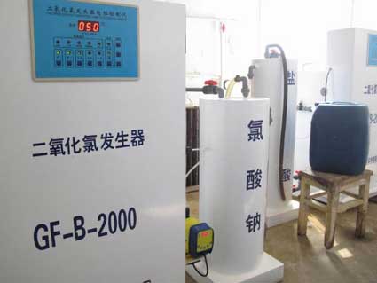 二氧化氯消毒处理器就设置在污水处理池旁的建筑内,制备出的二氧化氯就是从这里源源不断地输入到污水处理池进行消毒处理。记者注意到,二氧化氯制备设施并不复杂,分别是2个装有“盐酸”和“氯酸钠”的容器,两者进行化学反应便可生成二氧化氯,化学反应过程完全由电脑控制,自动化程度高。只是在大容器里的“盐酸”和“氯酸钠”消耗后,由人工往大容器续加便可。