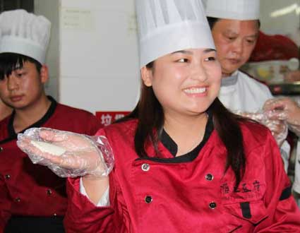 图二:来自美国多元文化传播集团领队谢紫筠学做“水晶白玉豆腐饺”