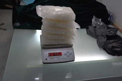 图:民警收缴的冰毒,5公斤!成为我市建市以来最多的一次。该案被公安部挂牌,列为“2014—567号”部级毒品目标案件。