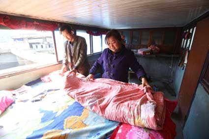 图二:渔民丁后霞正在收拾着准备搬家;