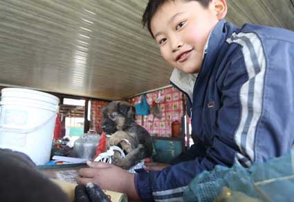 图一:船上的孩子正准备带着他的小狗离开;