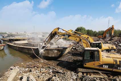 图四:挖掘机正在将渔船拖上岸;