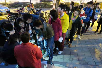 “双十一”这场全民网络抢购已经过去不少天了,不过快递工作者丝毫没有半点轻松,多家快递均不能按照正常速度及时派件,大量快件仍然积压在仓库和分流点等待派送。11月21日傍晚,天色已黑,位于淮南市洞山西路的几家快递分流点门前依然是门庭若市,大量上门取件的客户等待在门口排队,快递工作者更是忙得“招架不来”(如图)。据工作人员介绍,这边是一个快件自取站点,受“双十一”影响,很多堆积的快递无法及时取走,加上每日新的快件,自取点的仓库已经不堪重负,“快被挤爆了”。另一家快递的工作人员告诉记者,按照现在的仓存情况看,估计要到月底才能恢复正常派件速度。