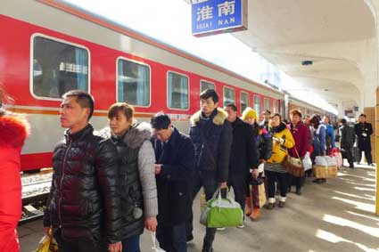 图:乘客正在淮南站排队上车