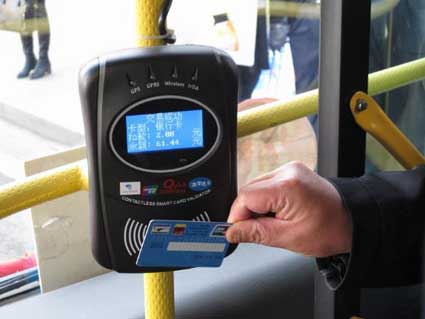 12月26日早晨,一辆辆带有大红花的34路公交车从始发站发动,这是淮南市市区第一批可以受理金融IC卡的公交车。随着公交车辆的运行,一路上不断有使用“淮南通”卡的市民刷卡上车。记者观察到,只要将“淮南通”银行卡面对着公交刷卡机轻轻一贴,听到“滴”的一声,支付就成功了。乘客们纷纷表示这种方式很方便,再也不用特意准备零钱了,又多了一种支付乘车费的方式。