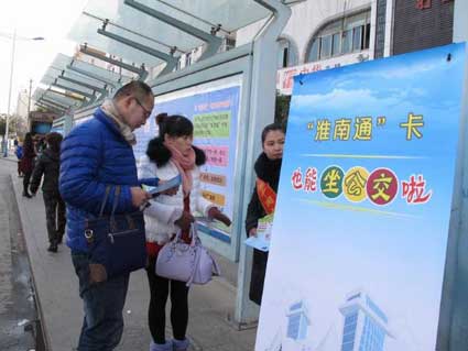 当天上午,淮南市“城市一卡通”市区公交系统上线启动会在人民银行淮南市中心支行举行,记者从会上了解到,淮南市“城市一卡通”是市政府提高公共服务水平的一项民生工程,是信息化建设、智慧城市建设的重要工作。2013年12月19日,淮南市“城市一卡通”即“淮南通”卡正式发行,目前在淮南各银行网点均可办理“淮南通”银行卡。