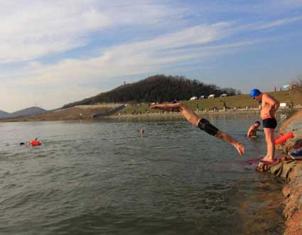 2015年1月1日,全国冬泳日。当天下午,记者跟随我市近百名冬泳爱好者来到泉山湖畔,迎着自湖面上吹来的寒风,身穿棉衣的记者禁不住瑟瑟发抖。“太冷了,这风打在脸上像刀子一样”。一位围观市民盯着脱去外套的冬泳爱好者好奇地说:“水里肯定冰寒入骨,他们真敢下去呀?”