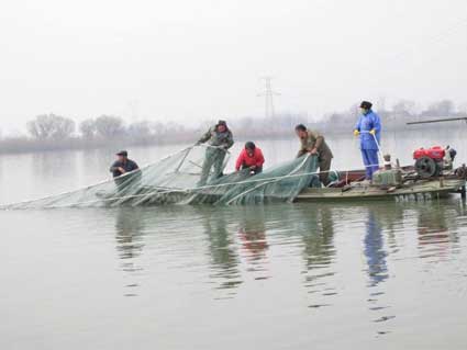 寒冬腊月,各类副食品大量上市供应年货市场,此刻,也正是渔民丰收的时刻。在淮南高塘湖,当地渔民研制成功一种大型“赶拦网”,以柴油机作动力收网,大水面上,一网可打10万公斤鱼,减轻了渔民劳作,极大地提高了捕鱼效率。