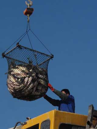 图二:塔吊助阵,把活鱼转至运输车上