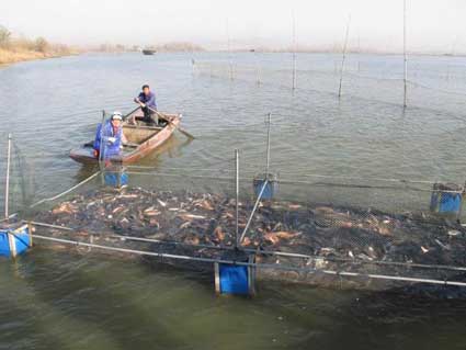 图三:捕获的鱼用小些的网箱转移至湖岸边