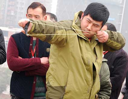 无论90后、80后、还是70后,甚至是60后,儿时都有玩弹弓的记忆。24日上午,一场由弹弓爱好者通过网络自发组织的弹弓竞技比赛在广场北路户外展开角逐,30位弹弓爱好者参加。比赛现场,参赛选手一字排开,一边感受着比赛的刺激,一边捡拾童年的回忆。如今,弹弓悄然发展成为群众们喜爱的休闲竞技运动。据了解,参赛的这些选手中,既有常年喜好弹弓的选手、也有受朋友影响喜欢弹弓的爱好者,他们参赛共同的心愿,就是在回忆童年美好记忆的同时,也能将弹弓这一运动推广开来,让更多的人喜欢这个运动项目。图一:比赛选手正在瞄准。图二:比赛裁判正在靶前为选手们计分。