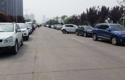 5月9日上午,记者经过花鸟鱼虫市场看到,该市场是在道路西侧,从湖滨西路与广场北路的十字路口一直往北延伸,很多市民每到周末都喜欢早早来到这里挑选最新鲜最好看的花草,记者来到此处时已是早上10时左右,该路段的路面被绿化带分成两条道路,一条由南向北,一条由北向南,而这两条道路的两侧都停满了车辆,应该有4条机动车道的道路硬是被挤成了两条机动车道,更有的车主因为找不到车位,干脆把车斜插在两车之间,汽车前半部在绿化带上,后半部则很突兀地停在机动车道上。