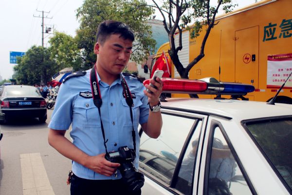 6月7日下午,记者跟随郭晨跑高考,了解其微博发布过程。下午2时多,正在泉山路口跑路况的他,突然接到信息,说淮南一中考点外,有一辆携带“高考爱心车”车贴未悬挂车牌的跑车被执勤交警拦下,接到信息后,郭晨和记者马上赶到现场。在现场,郭晨一边向执勤民警了解情况,一边对涉嫌违法车辆进行拍照,照片拍好后,郭晨站在路边顾不得擦去额头的汗水,抱着手机马上将现场情况发布到微博上,以警示广大驾驶人勿借高考之名,进行交通违法。发完这条微博后,郭晨带着记者又奔向淮南四中考点,在车上,他告诉记者:和你们记者一样,小郭跑高考讲究的是现场、是“活鱼”,来年他还将继续关注高考,争取为广大考生及其家长提供力所能及的帮助。(记者 苏国义 摄影报道)