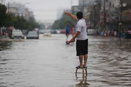 图:淮舜南路,一市民在水中指挥来往的车辆避开积水过深的区域。