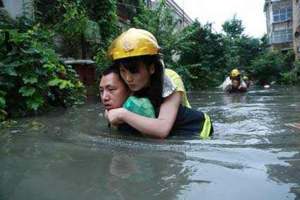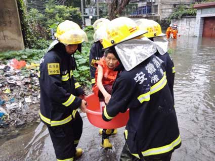 6月29日晨,国庆路一小区积水严重,消防官兵接到报警后紧急赶赴救援。这个建于上世纪90年代的小区积水最深处接近2米,消防官兵经过2个多小时的搜救,成功将20余名老人和妇女儿童背到安全地带,同时将住在一楼的住户向楼上疏散。