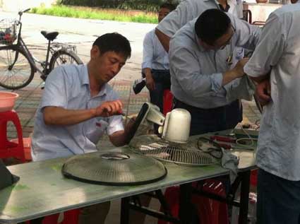 当日早上不到8时,田家庵电厂一号路上人声鼎沸,党员便民活动吸引了许多居民的注意,一张张桌子摆放整齐,一件件工具准备齐全,每个党支部的便民活动桌前都详细写着可以提供的便民服务内容,理发、修理家电、磨刀、量血压、计生知识宣传等应有尽有。相关负责人告诉记者,党员便民活动已经进行了20多个年头了,从未间断,今年有22个党支部共100多名党员参加,除了往年设置的活动之外,今年又根据居民需求新设了几个新的活动项目,例如清洗皮包,手机贴膜等,记者看到,手机贴膜的便民桌旁最为热闹,许多居民正在排队等待,“我这个手机型号的贴膜有没有啊?”“有的有的,我们准备了各种型号的贴膜,马上就帮你贴上。”