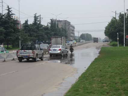 原本这里的道路就不算宽阔,没有人行道,机动车、非机动车、行人都在这条道路上通行,而积水将路面占据了一半,过往车辆和行人不得不绕行,积水使得道路通行能力不断下降。