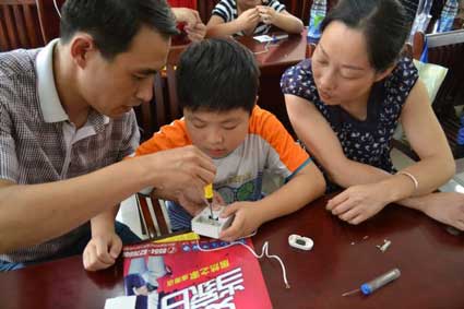电门铃看似不难做,但想把门铃做的好看、声音又好听可不简单。在活动现场,田家庵区科协主席胡斌担任讲课老师,向在场的家长、孩子们演示了制作方法。接着,在科普志愿者的协助下,15名孩子和他们的家长经过一系列组装、调整、焊接等步骤,终于组装完成电门铃,一阵阵悦耳的电门铃音乐声在房间里飘扬。“制作电门铃,让孩子在轻松游戏中变身小小‘科学家’,很有意义。”一名参加活动的家长这样评价道。