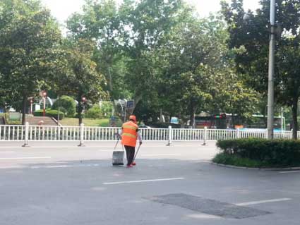 图二:在洞山中路,一位环卫工人在快车道上清扫垃圾。