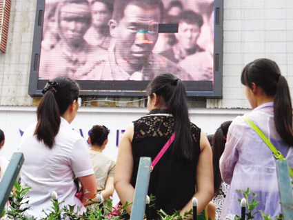 8月14日下午,记者来到潘集区黄山北路,这里是该区最繁华的商业地段,此时一家商厦外墙的大屏幕正在放映抗战经典电影《地道战》,一些市民从家中搬来了凳子现场观影,很多逛街的市民也驻足观看。记者看到,现场观影的市民各年龄段都有,观影时大多表情凝重。