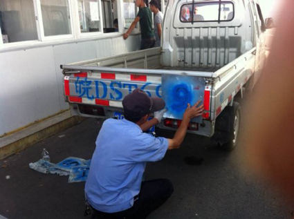 图一:工作人员免费对号牌不符标准车辆重新喷涂号牌