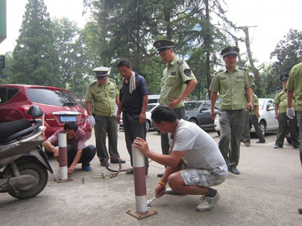 图三:在泉山路口东北侧广场,专业人员用工具清除设置在停车位上的停车锁。
