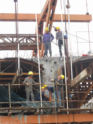 当前,主航道桥墩柱的浇筑标志着孔李淮河大桥工程第一关键性工程由水下转入水上施工;而副航道桥108#墩0#、1#块混凝土浇筑标志着又一关键性工程由下部结构转入上部结构的施工。待整个墩身浇筑完了以后,上面将进行钢桥梁的建设。