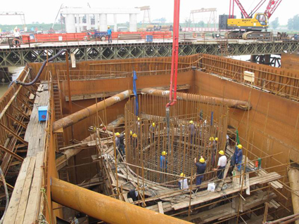 据了解,主航道桥129#、130#墩为跨淮河主航道桥两主墩,每个桥墩分左右两幅组成,每幅桥墩基础由70m长24根直径2.0m钻孔桩上接5.5m承台组成,墩高29m。承台由于位于水面以下20m,采用双壁钢围堰施工,钢围堰高27m。由于该段淮河经上千年的沉积,地质由砂岩、泥岩、胶质泥岩等组成,硬度大,粘性强,围堰下沉困难。同时,在围堰施工过程中,先后经历了罕见的洪涝灾害,高温天中围堰内气温甚至达到60度,建设者们通过了这些考验,完成了工作任务。