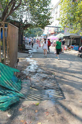 图为基地菜市西侧道路污水遍地恶臭熏人。
