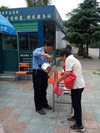 此外,该局还利用丁山路一处城管执法岗亭,安排城管志愿者值守,开展爱心服务活动。志愿者们及早在岗亭内备置饮水机、打气筒、旅游指南、椅子等一些日常生活服务工具,无偿为过往行人和外来游客提供临时休息、饮水打气、交通咨询等爱心服务,切实为“大八公山旅游嘉年华”活动增光添彩。