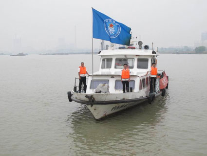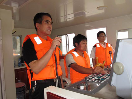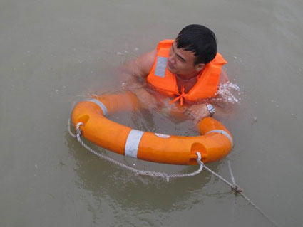 图四:渔政人员抛下救生圈施救逃生落水渔民。