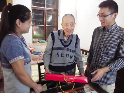 9月24日,在104岁荣棣鄂和105岁张玉珍老人家里,社区工作人员向老人献上了中秋月饼和温馨祝福。两位精神矍铄的老人看到社区工作人员前来看望,高兴得乐开了花。
