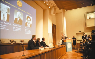 5日上午10时,瑞典卡罗琳医学院的诺贝尔大厅内,挤满了来自世界各国的记者。11时30分,诺贝尔生理学或医学奖评委会常务秘书乌尔班·林达尔和3位评委进入诺贝尔大厅。林达尔先后用瑞典语、英语宣布,将2015年诺贝尔生理学或医学奖的一半授予中国药学家屠呦呦,另外一半授予爱尔兰科学家威廉·坎贝尔和日本科学家大村智。屠呦呦的获奖理由是“有关疟疾新疗法的发现”。在林达尔宣布的同时,大屏幕上出现的照片和简介,让世界认识了这位来自中国的科学家——照片中,屠呦呦戴着眼镜,嘴角微微带笑,简介中写着“生于1930年,中国中医科学院,北京,中国”。
