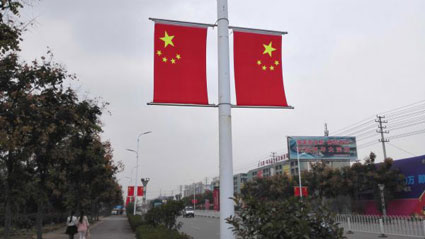 图一:凤台县城主干道沿路挂满了五星红旗,使整座县城充满了浓烈的国庆气氛。10月6日,记者在凤台县城走访时看到,城区主干道沿线灯杆上均挂上了鲜艳的五星红旗。一位当地居民告诉记者:“看着这些鲜艳的五星红旗,我们心中不由自主地升起一份对祖国的敬意,并感受到了浓烈的国庆氛围,祝福我们的国家发展的越来越好。”(记者 苏国义 摄)
