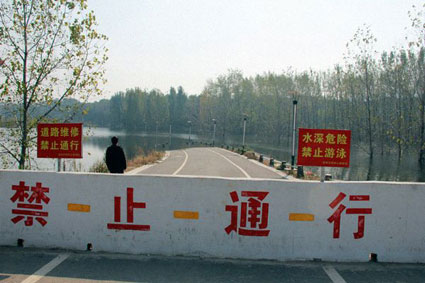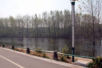 近日,记者来到市民反映的被淹地段,该地段位于淮舜南路东侧、大通湿地公园东北侧。在现场记者看到,此处的环山路部分路面和景观路灯都浸泡在水中,道路已经被一道砖墙完全封闭,并且悬挂了“水深危险,禁止游泳”和“道路维修禁止通行”的警示标牌。而环山路南面大面积的林地已被水淹没。是什么原因导致该地段突然被淹?而水又长期不退呢?记者找到了大通区人大副主任邹用德。