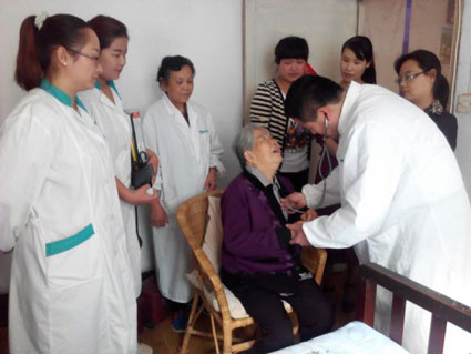 为迎接重阳节到来,10月19日下午,国庆街道金豪社区联合社区卫生服务站开展“送医入户”活动,为社区6名行动不便老人免费体检看病。